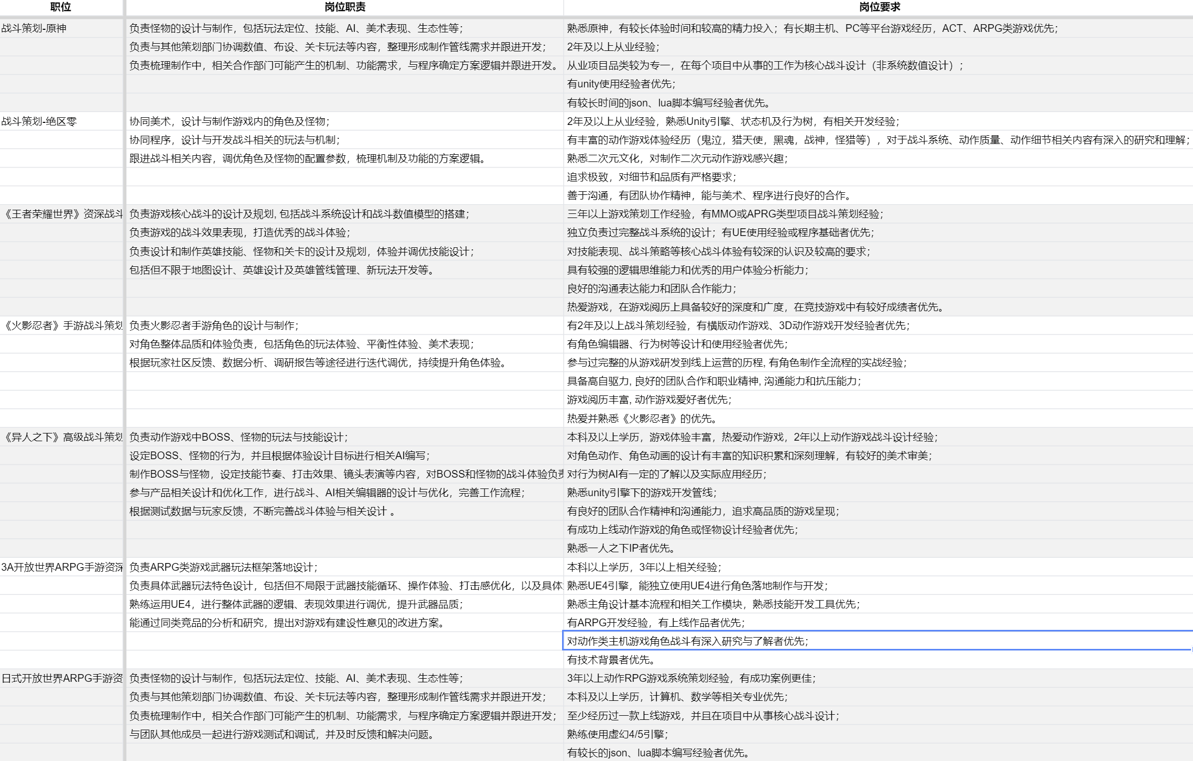最近汇总了米哈游和腾讯一些社会招聘岗位关于战斗策划怪物方向的岗位描述和能力要求,做了一些资料汇总和总结的工作。用于后续能力补足的参考。