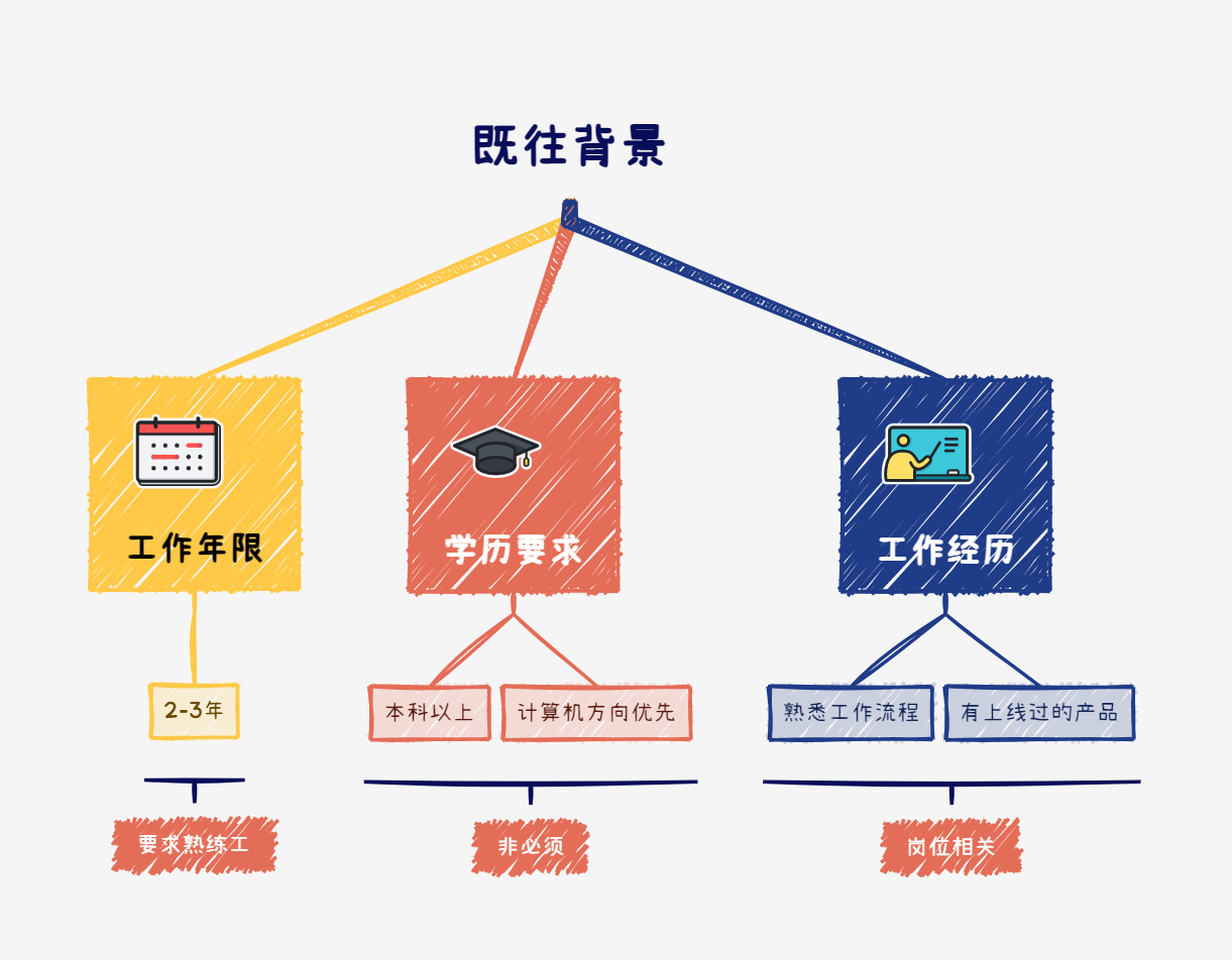 - 工作经历要求:多为岗位相关要求,比如熟悉工作流程、有上线过的产品等