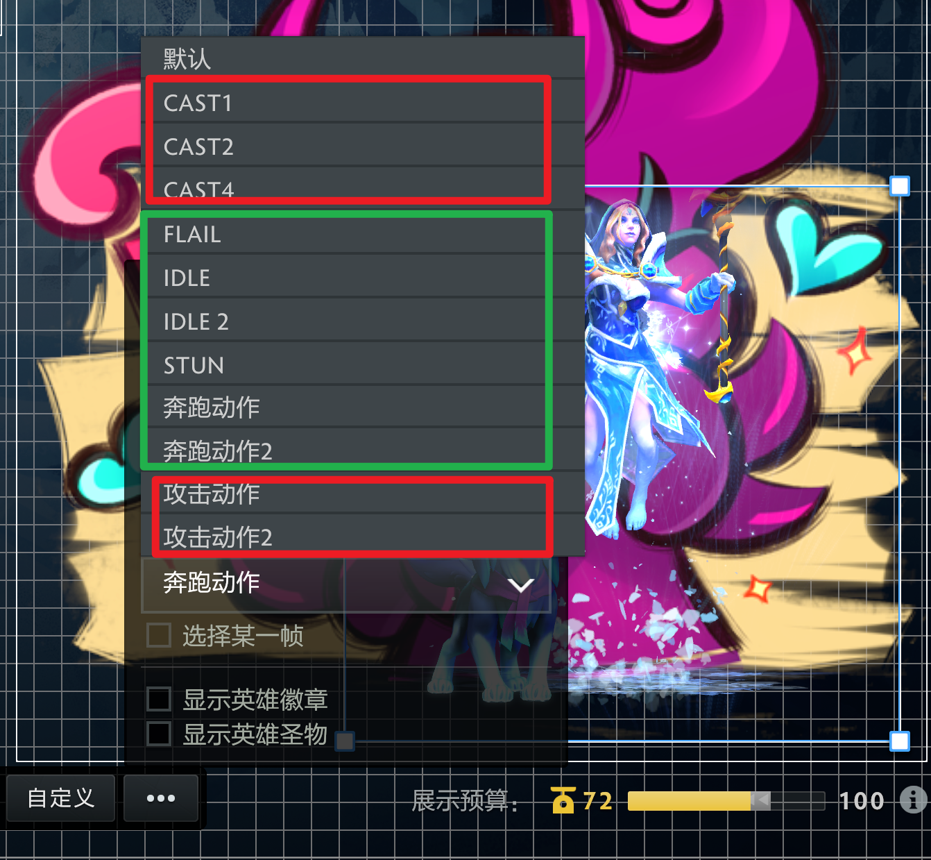 游戏中英雄的基础动画数并不多,以至宝冰女的动画为例,仅有5个定制动作与6个基础动作合计11个动画。(注意,上文可是提到了25种以上的状态机制,尤其是控制机制是会需要动画表现的!这个问题如何解决?)