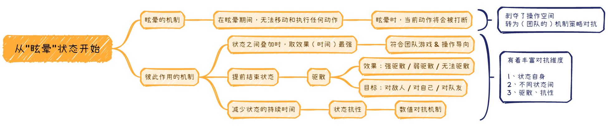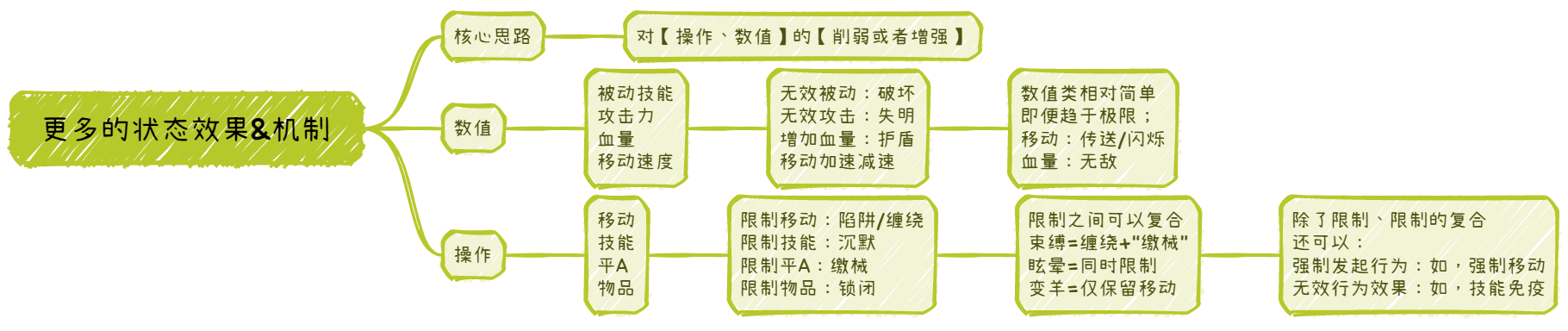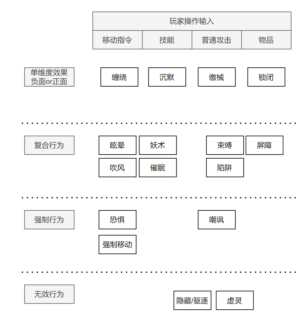 这个困境直到有一天,在对这些状态效果进行反复划分和归类时,得到了解决,最终得到了右边所示的、一个相对优雅的划分和思路,后文将沿着这个思路逐渐展开。