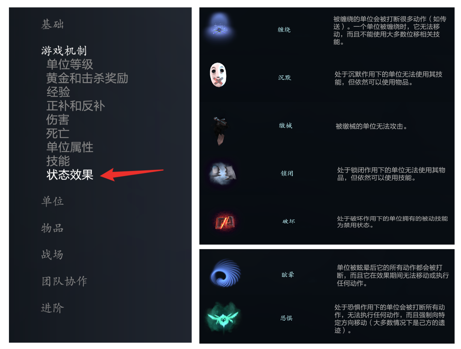 其一,新手教学:游戏内部的术语说明中,也有介绍这基础的5种状态(还有十分常见的眩晕和恐惧)。