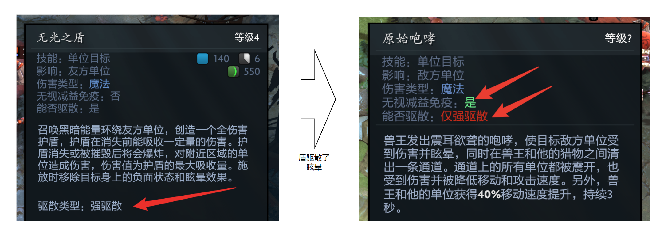 如上图所示,亚巴顿的无光之盾技能驱散了兽王的吼的眩晕。