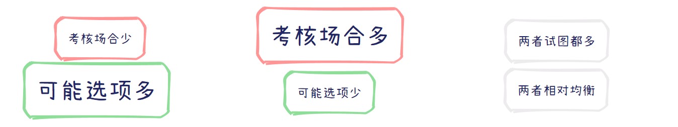 在基本的奖惩导向方针以后,可能还会面临一个分配问题,是设计更多的考核场景?还是给玩家设计更多的选项?这里其实有一些选择的方式,比如: